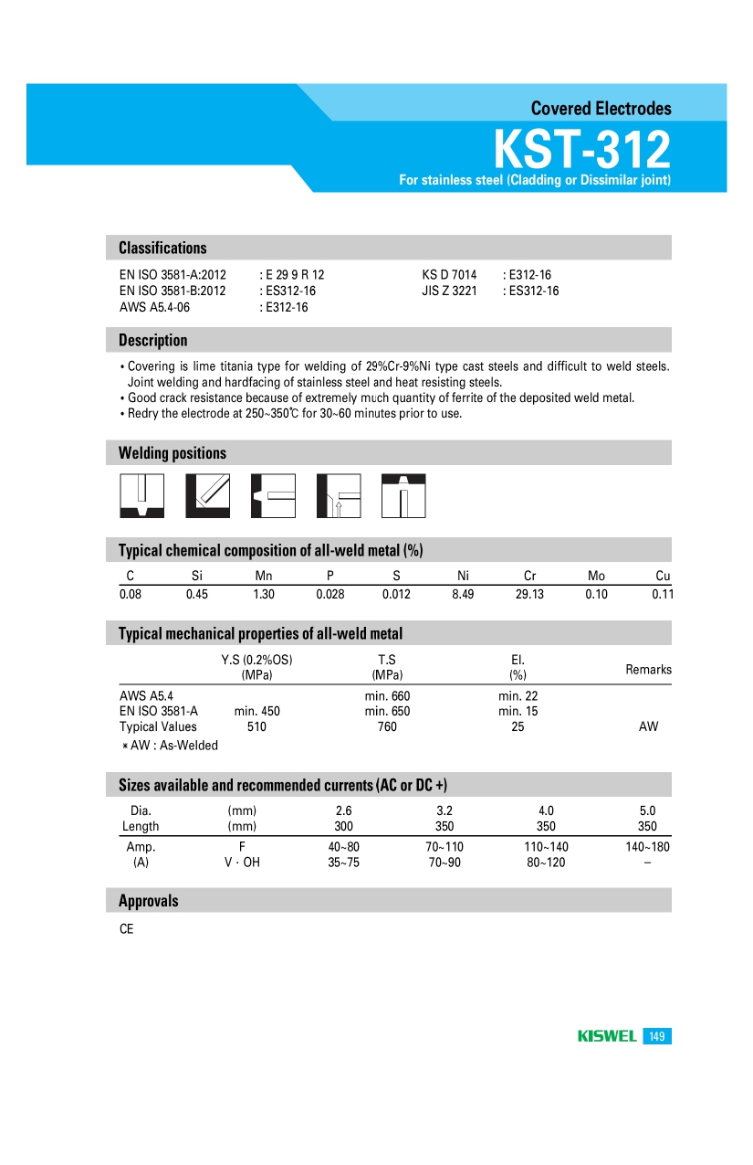 Que hàn inox KST-312 được thiết kế để sử dụng cho hàn thép khác thành phần và thép khó hàn, hàn lớp lót trước khi hàn đắp cứng. Kim loại mối hàn với thành phần 29% Cr - 9% Ni và gồm một tỷ lệ lớn ferit, có độ bền kéo rất cao và khả năng chống giòn hoàn hảo.
