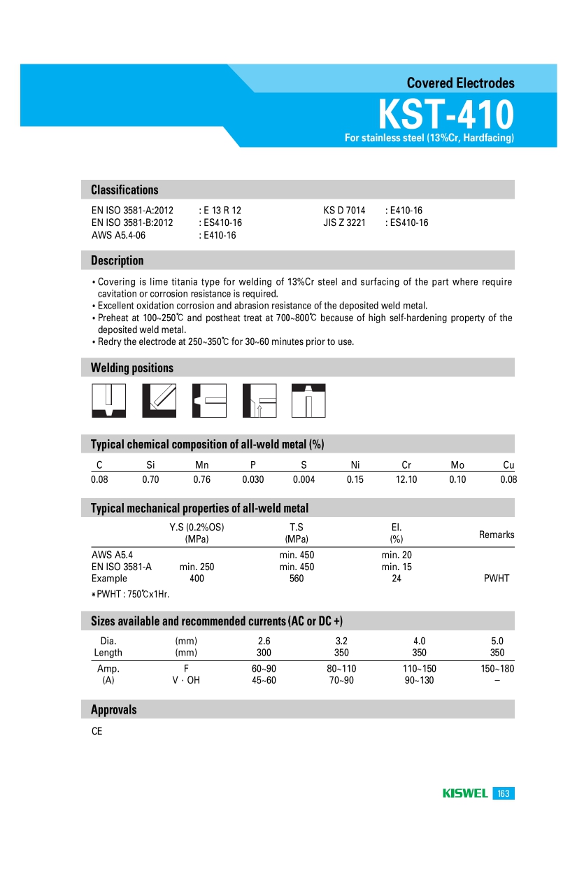 Que hàn inox KST-410 là sản phẩm que hàn điện bọc thuốc dùng để hàn thép hợp kim có chưa 13%Cr. Được ứng dụng để hàn bề mặt và các bộ phận bằng inox yêu cầu khả năng chịu được sự mài mòn cao